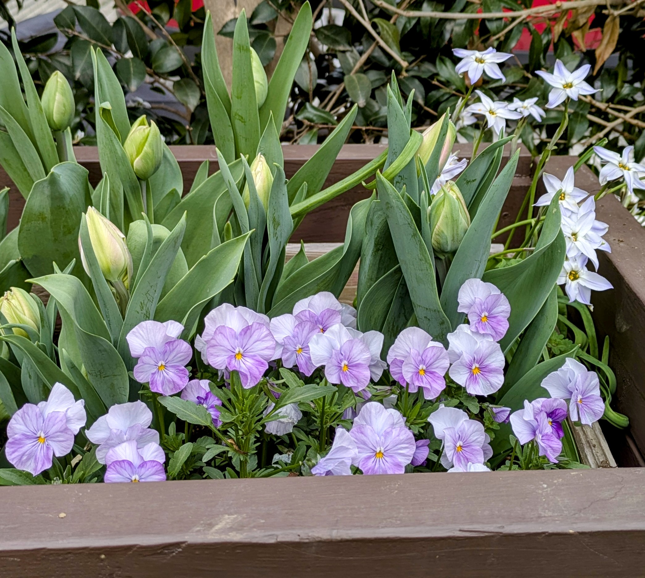 花壇の前方ではビオラなごみももかかすみが咲いています。