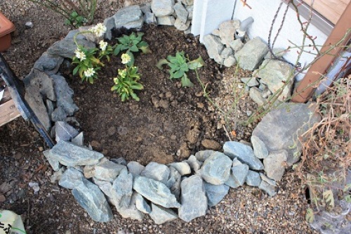 ものすごーく久しぶりの日記になってしまいました~。。。(汗)実はかなり以前になりますが(数週間前か?)体調を崩して寝込んでしまいました。でも無事に回復して、その後は元気に過ごしていたのですが~~。。。何でしょう?お庭に対するモチベーションがす~っかり低下してしまい、お庭もブログもおさぼりをしてしまっておりました。まあ、無理しても仕方ありませんしね~(自分に甘い人間であります)でも昨日は久しぶりにお庭に出ておりました。そして何となく、転がっていた石を積み重ねて花壇を作ってみました。綺麗なブルー・・・・実はこの石、我が家のお庭から出土した石なのです。家の庭は、ものすごーく粘土質の土なのです。土壌改良して、少しはましに成ってまいりましたが、もう以前は最悪!!綺麗なブルーの粘土&石がゴロゴロ出ておりました。なので、陶芸が趣味の叔母にふざけて渡してみました。すると~??こんな物に変身して戻ってまいりましたよ~花瓶。。グレーの色の部分が、我が家の粘土らしいです(笑)叔母の陶芸仲間の方が、『送料を払うから粘土を送って欲しい』と、おっしゃっていたそうですが、軽やかにお断りさせていただきました。ヤダヤダよーだ。穴掘り作業は過酷なのだ(笑)しかし厄介者の粘土めが、姿が変わればこんなになるのね~。っと、何だか笑ってしまいました。ブログランキングに参加しております。下の↓ 小鳥をを1日1回ポチリとして頂くと、ランキングに反映される仕組みになってます。どうぞよろしくお願いします♪にほんブログ村