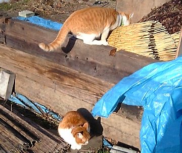 今日の朝もチョロちゃんとブッキーを連れて畑へ行きました。最近は、ブッキーも畑に付いてくるようになり畑に着くなり二人は、追いかけっこをして走り回っています。チョロちゃんが木の上で休んでいるとブッキーが、チョロちゃんの場所を奪い取ろうとして木に登ってきました。チョロパンチがブッキーに炸裂するのかと思い見ていると、意外とすんなりチョロちゃんは、場所を譲ってしまいました。この2人は、畑では追いかけあいをして遊んでいますが家の中では、相変わらず仲がいいのか悪いのか分かりません。当然一緒に寝ているところなんて見たことがありません。何時になったら一緒に寝ているところが見れるんでしょうかね。