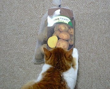 今日は、しとしとと雨が降っていてこれでは、畑にも行けません。暇な一日になりそうです。朝8時過ぎにファーマーさんから電話が入り『インカのめざめ』を買いに行ったのですが売り切れていたらしいです。天国から地獄とは、このことですね。それから少ししてから、またファーマーさんから電話が入り、天王寺区の四天王寺近くの園芸店に『インカのめざめ』があるとの情報が入りました。それから一緒に天王寺区の園芸店に行くとそこには、お目当ての『インカのめざめ』がタップリとありました。私は、取りあえず『インカのめざめ・ジャガキッズパープル』の2品種を購入しファーマーさんは、『インカのめざめ・シンシア』の2品種を購入しました。『インカのめざめ・ジャガキッズパープル』のどちらも作るのが難しそうで少し心配です。失敗したときのことを考えてメークィーンかキタアカリを少し植えておかねばならないでしょうね。種芋が手に入ったらムズムズして、すぐに植えたくなってきました。待ち遠しいですね。写真を撮ろうとしているとチョロちゃんが来て『これ何?』って感じで匂いを嗅いだり右手で触っていました。