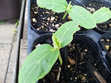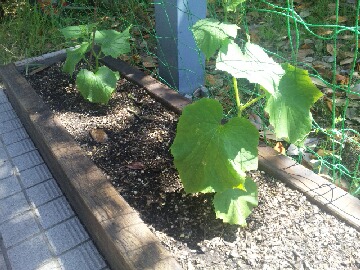 今日の大阪の最高気温は27.5度まで上がったらしく、これで平年並みの気温だそうです。それにしても蒸し暑い一日でした。職場で種蒔きしたキュウリに、ようやく本葉が出始めました。金曜日の夕方に木枠に植付けたのですが、本日確認したところ更に大きくなっていました。2m90cmの木枠に4本の苗を植付けたのですが、うち1本がダンゴ虫の被害に遭ってしまいました。幸いにも本葉は被害に遭っていないので、何とか復活してくれるとありがたいんですけどね。