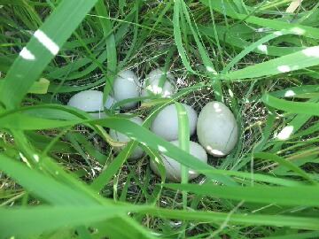 本日も大阪は一日中晴れて最高気温も30度を超え、ジメジメとした蒸し暑い一日でした。今日から会社には造園屋が草刈のために入っているのですが、おじさんが鳥の巣に卵があって、その場所の草刈は出来ませんでしたとの報告が・・・。見に行くと2m四方が刈られずに残っていました。雑草の中を覗くと7個の卵が並んでいました。おじさんが言うにはキジの卵だと言っておりましたが、以前からその場所にはカルガモがうろついているのを見たので、多分卵の持ち主はカルガモだと思います。多分、巣の周りの環境が変わったので、カルガモの親はもう巣には戻ってこないいかもしれないです。もし、戻ってきて卵を温めるようなら可愛らしいカルガモのヒナが見れるかもしれないです。