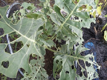 今週は台風の影響で雨だと思っていたのですが、水曜日くらいまでは雨が降らないような予報になっていました。まぁ、予報なのでどうなるか分かりませんけどね。今の時期、野菜は一週間もすれば見違えるような生長をしますが、雑草も同じように生長するので、手入れが大変です。お湿り程度の雨が降った後なので、適度に湿気もあり、雑草を抜くのは簡単でした。雑草を綺麗に抜きさると、虫食いの酷いキャベツが顔を出しました。キャベツを観察すると、かなり奥の方まで虫が入っていそうな気配です。そろそろ収穫できそうな大きさなのですが、めくっていくと小さなキャベツになりそうです。