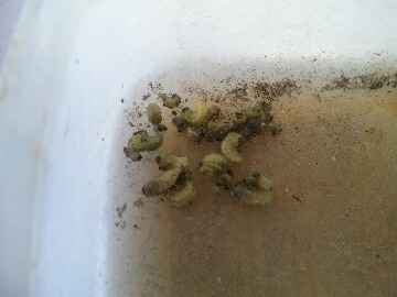 昨夜12頃に寝たのですが、1時過ぎに目が覚めてから結局朝まで寝ることが出来ませんでした。寒くなってからは畑に行くのは9時を回ってから行くのですが、今日は薄暗い7時前に行きました。雑草の手入れやホウレン草の収穫などをしようかと思っていたのですが、あまりの寒さのため区画を見て回っただけで、何もせずに引き上げてきました。一体何をしているんでしょうかね。(笑)昨日、畑に行ったときに、時間差で植付けたハクサイが虫食いだらけになっているのに気がつきました。先週末は虫食いもなく綺麗なハクサイだったのに一週間で別物のようなハクサイになっていましたよ。よ~く見ると小さな(1~5mm)くらいの何かの幼虫が・・・。あまりにも小さいので、ピンセットで摘まんで駆除しました。2株の小さなハクサイに30匹もの幼虫がいましたよ。