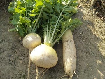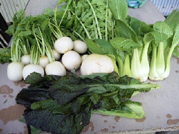 本日は晴れ間も出て少し肌寒いですが、まずまずの天気です。昨日は畑にいけなかったので、本日は小カブの最後の収穫をしに畑に行ってきました。小カブは今回で3回目の収穫となります。でも、最後の収穫ということで少し残念です。第2弾第3弾と作っておけばよかったと後悔しています。小カブ10株の他に青梗菜6株にファーマーさんが悪戯で蒔いた聖護院ダイコン1株、それに初めて作ったタカナの葉を数枚を収穫しました。