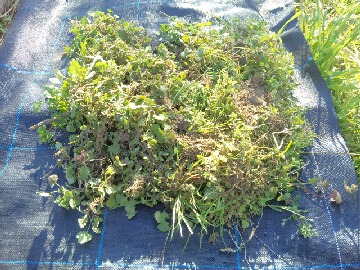 今日は一日中気温も上がらず寒~い一日でした。多分、最高気温も5~6℃で、昼過ぎには雪もちらつき、初雪となりました。夕方5時半頃の気温は3度まで下がり、かなり冷え込んでいます。日曜日に畝の荒起しをした後にタマネギ畝の手入れを行いました。夏の雑草と違って、小さくてもしっかりと根を張っているので抜きづらかったです。タマネギ畝の雑草はこれだけありました。雑草を抜いた後、遅れていた追肥(鶏糞)を行いました。