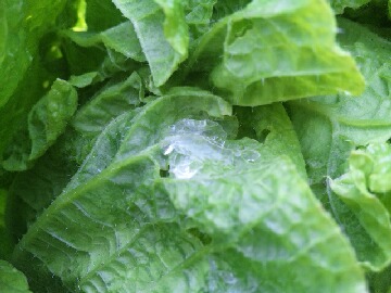 本日は、この冬一番の冷え込みとなり、大阪でも1℃前後まで気温が下がったようです。今朝は何時もの時間に起きたのですが、あまりの寒さで畑に行ったのは9時を回ってからになりました。寒さのためか畑には誰もいませんでした。何時ものように、まずはハクサイのチェックからやったのですが、霜というよりハクサイについた水滴が凍っていました。やはり山に近い分、気温もかなり低くなったようです。(チョット分かりにくいかも)このハクサイは、かなり大きいのですが、まだ完全には巻いていないようで、触ると柔らかく締まっていないです。収穫をするには、もう少し時間がかかりそうです。