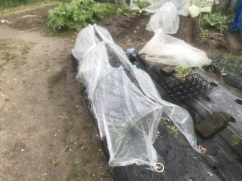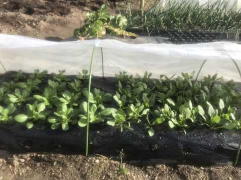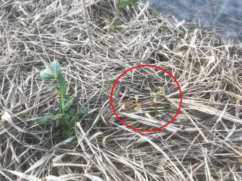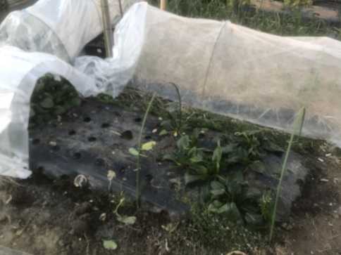 今年は寒いという事だったので不織布のトンネルにしたのですが、一部の苗が枯れちゃいました。まぁ枯れたといっても一部の株だけなので問題はないと思いますけど、ただ週明けからの寒波でどうなるのか心配です。寒さで先端部分が・・・この株もヤバいかもしれないです。ビニールをすると日中の温度管理が大変なのですが寒波が去るまで透明のマルチでトンネルをした方がいいだろうという事で不織布の上から透明マルチでトンネルをしておきました。