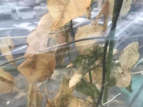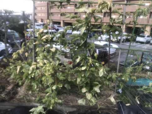 1月5日のブログで報告をさせていただきましたパッションフルーツにビニールシートで保温をすることに・・・。以前報告をした時よりも葉が白くなっている個所が多くなってきています。シートをするにあたり、少し蔓の剪定をしています。今回使用したビニールシートはマルチ用の物なのでかなり薄いものです。果たしてどこまで効果があるか疑問ですが、ないよりかはマシだと思います。
