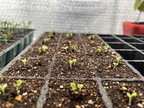1月13日に種蒔きを報告した第2弾の小松菜が無事に発芽しました。一か所につき2粒ずつ種を蒔きましたが発芽率100%でした。温室の中は暖かいようなのでしっかりと生長してくれることでしょう。でも植え付ける場所が!(◎_◎;)・・・どうしましょう。