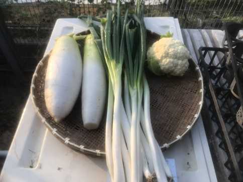 昨日は午前中にどうしても外せない仕事が午前中にあったので昼から畑へと行ってまいりました。会社の同僚が野菜が欲しいというのでお裾分け用に収穫。今回、収穫した物はカリフラワーに九条太ネギ、総太りダイコン、源助ダイコン、ブロッコリーの側花蕾、ホウレン草です。源助ダイコンですが、収穫するのが遅れて少し大きくなりすぎています。九条ネギの全体の長さが1メートル越え、白い部分の長さは約40センチとなっています。もう長ネギのようです。ブロッコリーの側花蕾も順調に収穫が出来ています。やはりこの時期のホウレン草は秋口とは違い肉厚で物凄く甘くなっています。