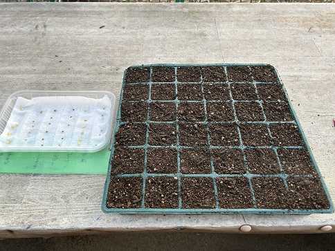 昨日の日中の最高気温は6℃とかなり寒かったです。夜中に雪が降ったようですし、お昼ごろにも雪が降っていました。この寒さも今日までで、明日からは暖かくなるようです。例年は苗から育てている夏野菜ですが、今年は種から育ててみようかと思い6種類の種を購入。大玉トマトの麗夏、中玉トマトのシンディースイート、ミニトマトのプレミアムルビー、中長ナスの黒秀、甘長唐辛子の柳美、ジャンボピーマンの6種類です。種を直接土に蒔くのではなく、種を芽出しするためにトレイで水を吸わせています。左から甘長唐辛子(柳美)、ナスビ(黒秀)、麗夏、ミニトマト(プレミアムルビー)、ジャンボピーマン、中玉トマト(シンディースイート)を各6粒(予備含む)ずつです。実際に植付けるのは各2本になると思います。