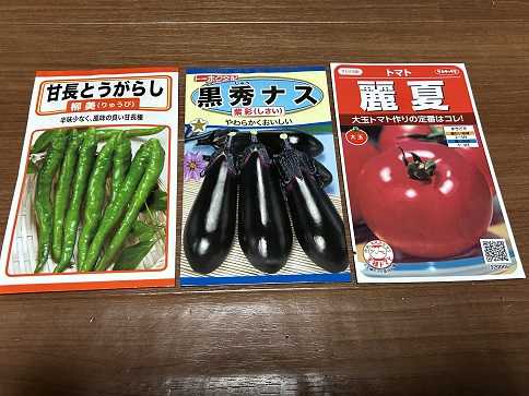 HCで麗夏・ナスビ(黒秀)・甘長唐辛子(柳美)の種を購入してきました。何時ものことですが、HCに行くと品種が多すぎて種売り場の前で悩みに悩んで購入したのが写真の物です。