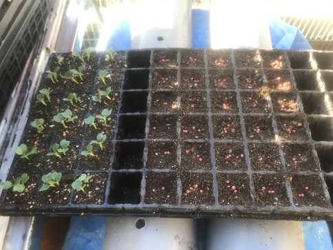 寒さのため第5弾で種蒔きは止めようかと思っていましたが、意外と温室に入れておくと直ぐに発芽してくれることもあって、また種を蒔いてしまいました。今回も一か所につき3粒ずつ種を蒔いています。温室の中なので一週間もすれば発芽してくれることでしょう。第5弾のホウレン草にも本葉が出始めてきました。植付けは来週くらいにしようかな。第2弾の小松菜は小さな本葉が出始めていますが、植付けまでにはもう少しかかりそう。