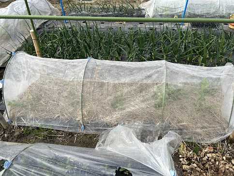 今朝は朝からどんよりとした曇り空です。この後、明日の昼過ぎまで雨の予報になっています。ここ暫くの間、生長具合を見ていなかった第4弾のホウレン草と小松菜ですが二週間ぶりに確認。薄手のビニールでトンネルをしていることもあって生長がイマイチかなって思っていましたが、意外と生長していました。でも次から次へとホウレン草を作っていることもあって、消費が追い付かなくなってきました。もう少しで収穫が出来そうになっています。ホウレン草は何ともありませんが、小松菜の葉に虫食いの後が・・・やはり外気に比べ暖かいので虫が活動しているようです。今のところ左程影響はないので問題はありませんが酷くなるようなら唐辛子入りの野菜酢でも散布してみようかな。