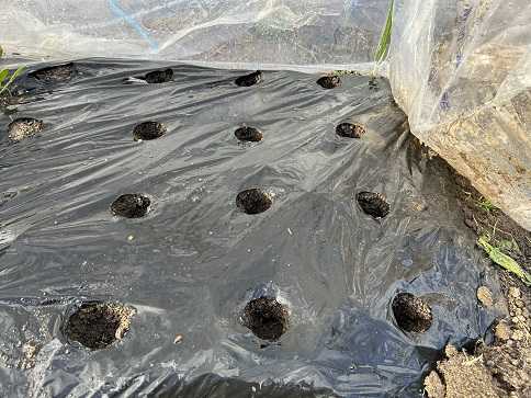 もう少しで春ジャガの植付けが始まりますが、今年は何株植付けられるのか確認をしました。今までの経験上では通常栽培のジャガイモは40センチ間隔で18~20株、芽挿し栽培のジャガイモは30センチ間隔で30株くらいでした。今年は通常栽培の株間を35センチ、芽挿し栽培を25センチにしようと思っています。寸法を測ると通常栽培が24株、芽挿し栽培が32株、更にマルチをしているので畝の肩に近い所に植付けると真ん中にも植付けられるので46株植付けが可能となります。通常栽培芽挿し栽培