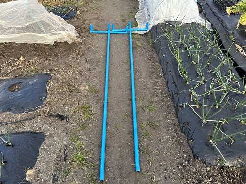 昨日は霙が降ったりして、とても寒かったですが、今日は更に気温が低く寒くなるようです。先日、頂いたパイプで作ったナスビ専用の支柱が完成しました。仮に設置しましたが何かイメージと違うんですよね。よくよく見ると十字に取り付けたパイプの位置がもっと下の方がよかったかも。それに畝幅くらいの長さが必要でした。十字の両サイドの支柱はナスビの枝を誘引するためのものです。仮設置ですので、実際はもう少し深く打ち込みますし、苗を植付けたら感じが変わるかも。