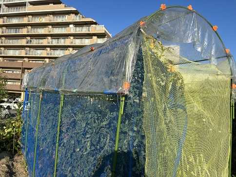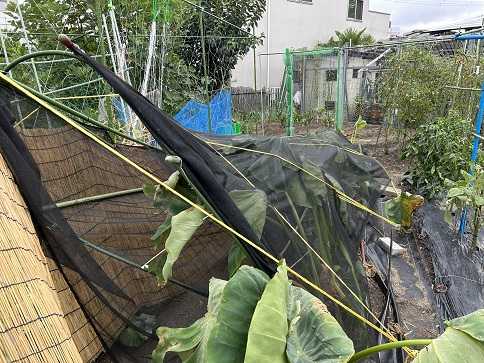 何年かぶりに近畿地方を直撃した藍風7号ですが、線状降水帯などの発生で各地に被害が出ているようです。大阪では雨風が強かったですが、紀伊山地や生駒山地に遮られて思っていたよりも被害が少なかったように思われます。朝6時ごろに菜園仲間のファーマーさんからサトイモ畝の支柱が大変なことになっているとの連絡が入りました。まぁ覚悟はしていましたが、写真を見ると・・・強風で、ものの見事に倒れていました。杭を打付けて支柱を固定していたのですが、そこから支柱が折れていました。やはりスダレと寒冷紗を外しておくべきでした。特にスダレが原因かな?葉はボロボロでグッタリとしています。復活してくれるといいのですが。取り敢えずスダレを外して、倒れている支柱を元に戻しておきました。外したスダレは天井部に・・・。とにかく蒸し暑くって、本日はここまでで終了。週末にでも補修を行うつもりでいます。