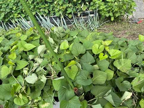 昨夜9時半ごろにポツポツと雨が降り始めたので、雨雲レーダを見るとしっかりとした雨雲が・・・期待したのですが、結局ポツポツと降っただけで恵みの雨とはなりませんでした。今日は大気が不安定で雨が降る予報になっております。恵みに雨となることを期待したいです。毎日、猛暑日が続いておりますが、この猛暑一体いつまで続くのでしょうか?少し落ち着いて欲しいです。暑い日が続いて、もうグッタリで夏バテ気味です。菜園仲間のファーマーさんがサツマイモの垂直栽培なるものをされています。サツマイモといえば地面に這わして栽培するものだと思っていたのですが、最近は上に蔓を伸ばして栽培する方法があるようです。10株ほどを栽培されているのですが、総て垂直栽培をされているのではなく半分だけされており、従来通りの栽培方法との違いを試されているようです。上に蔓を引っ張り上げていることから根元はスッキリとしています。手前が垂直栽培で、奥が従来通りの栽培です。ファーマーさん曰く、蔓を引っ張り上げたりするのが手間だと言っておりましたが根元がスッキリとするので狭い区画の畑にはいいような気がします。来年は少し考えてみようかな。