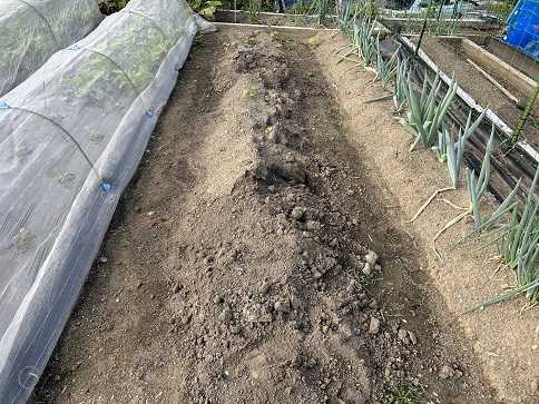 少し前にサツマイモの跡地を耕運しました。この跡地には直ぐに何かを植付ける予定はないので耕運をしてシートをかけ寝かせておきます。40Lの牛糞を一袋を畝へ夏に刈り取ったイネ科の雑草を5~10センチに裁断耕運機で一気に耕運軽く畝上げをした後にシートを被せています春先に何かを植付けるときに再度耕運をするつもりでいます。