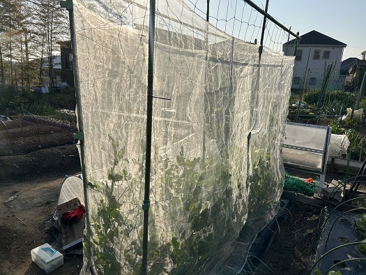 スナップエンドウを植付けている畝は、北西風がまともに当たることから寒冷紗で風よけと防寒を兼ねて寒冷紗でぐるりと囲っていましたが撤去しました。撤去前撤去後まだ畑にはヒヨドリが居座っているのですが、ここまで大きく生長したら問題はないと思います。