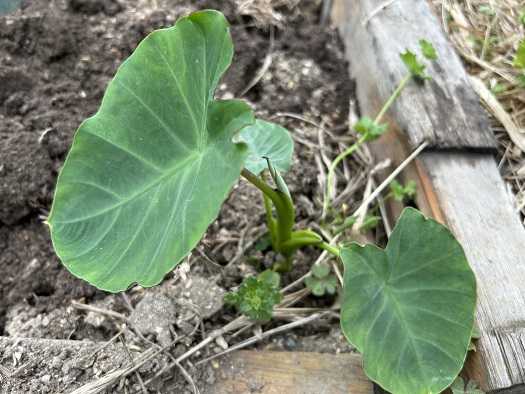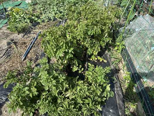 朝から晴れわたり気温も上昇、そのうえムシムシしていて、梅雨入り間近といった感じです。ここ数年、サトイモの出来具合が悪く、今年は作るのを止めるつもりでいたのですが、勝手生えしてきた芽が2本あったことから2株だけ作ることにしました。陽射しの影響なのか、水不足の影響なのかは分かりませんが、干害の被害に悩まされていました。サトイモは、元々田んぼの畔などの水分の多い場所で育てる事から、今年は水不足にならないようにビニールシートで保水することにしました。保水だけで干害を防げるかは分かりませんが、上手く出来るようなら、来年からこのやり方を採用したいと思います。