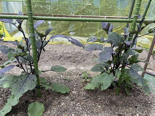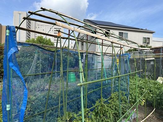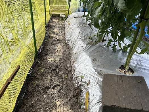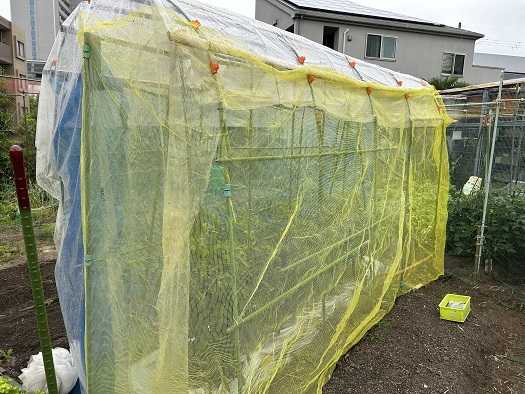 日曜日に雨除けのビニールも設置したこともあって、トマト畝全体をネットで囲みました。これでカラスも手出しは出来なと思います。