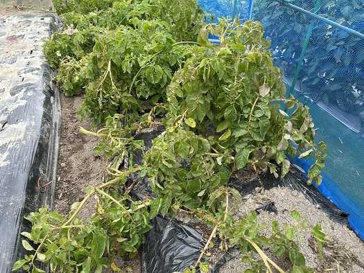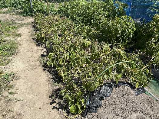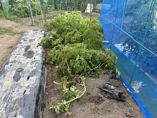 昨日、セミが鳴き始めていました。セミの鳴き声を聞くだけで、余計に暑く感じられます。もう梅雨明けなのかな。毎年、一部のトマトに尻腐れ病が発生することから、トマトの根元と通路に苦土石灰を散布しました。今のところ、トマトの生長は順調で、尻腐れ病の兆候はありません。後、ナスビはマグネシウムなどを大量に吸収することからナスビにも苦土石灰を散布しています。昨日、菜園仲間のファーマーさんからLINEが・・・送られてきた写真を見ると無残な姿が・・・。ネットを張り巡らせるか、何かカラス対策をせねばいけないようです。