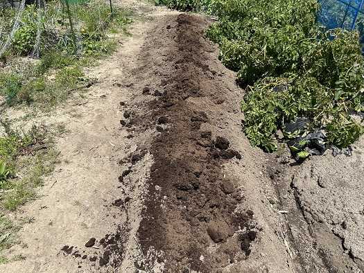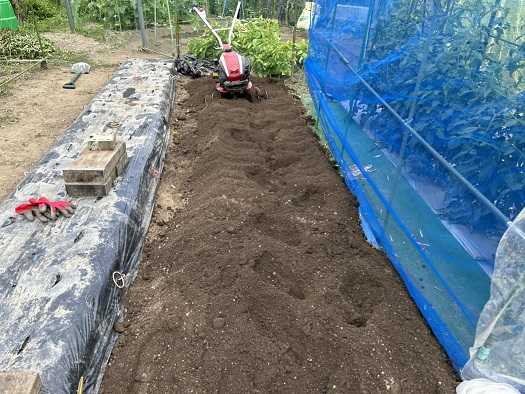 インカのめざめの跡地には枝豆を植付けようかと思い、早速耕運機で耕運しました。元肥として牛糞に鶏糞を耕運前に投入。耕運機で2往復して耕運完了。畝上げ。ジャガイモに使っていたマルチを再利用しています。
