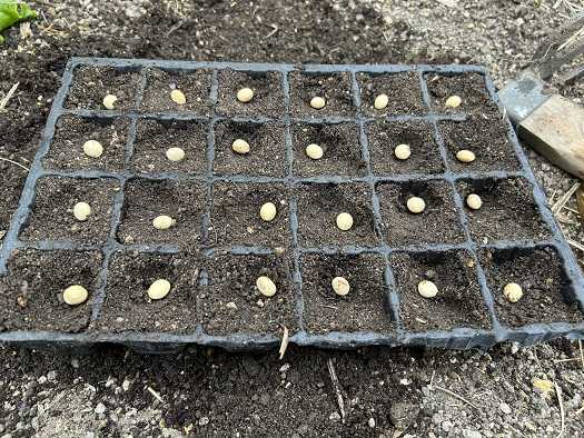 今年はインゲン、エダマメ等の豆類の発芽が悪く、インゲンは2株しか発芽しませんでした。やはり2株だけでは欲しい数だけ収穫が出来ないので、第2弾の種蒔きをすることにしました。種を購入しなければいけなかったのですが、自家採取した種が小屋から出てきたので、それを使うことに・・・。自家採取した種なので、無事に発芽するかは分かりませんが、取り敢えず蒔いてみないことには先に進めませんからね。特に大きな種を選んで蒔きました。