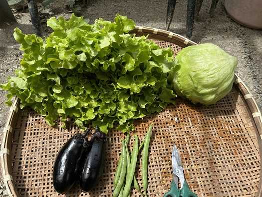 朝、起きて外を見ると雨は降っていなかったので、朝食を食べてから畑へとGo・・・。暑さのため、収穫まで漕ぎつけることが出来るのか心配だった玉レタスとリーフレタスを収穫しました。レタスって触るとふんわりとした感触なのですが、今回収穫したレタスはキャベツのようにギュッと締まった感じです。少し収穫が遅れたのかもしれません。他には、初生りナスビ2本にインゲンを少しだけ収穫しています。会社の同僚でもある菜園仲間のIさんが、珍しく朝から来られていたので、玉レタスとリーフレタスをお裾分けをしています。