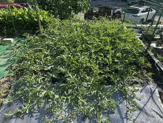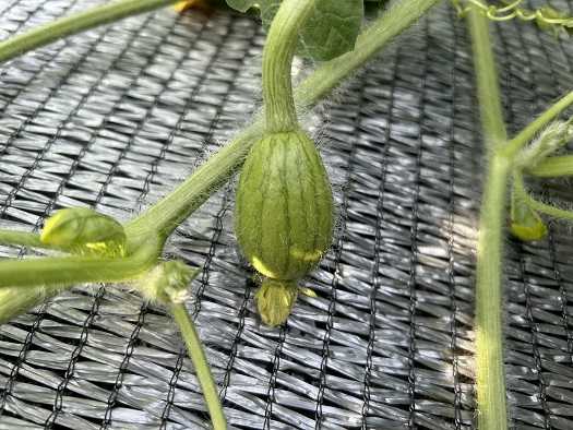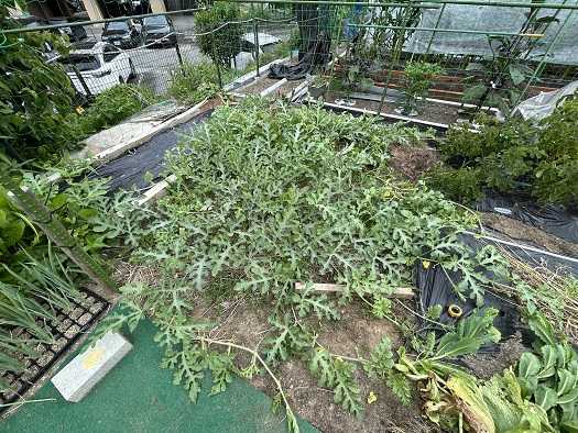 昨日、九州・四国・中国・近畿地方が梅雨明けしました。7月上旬に梅雨明けしたことはありますが、6月に梅雨明けしたのにはビックリです。梅雨の時期に雨が降ったのは10日程だったので、間違いなく水不足になって、コメの高騰に拍車がかかりそう。それに猛暑の影響で葉物野菜の値段も高騰するのではないでしょうか。人工授粉させても着果しなかった小玉スイカですが、確認したところ蔓の先端部分に着果した小さなスイカが7個確認できました。スイカの大きさからして着果後、数日だと思います。。それにしても蔓の勢いが物凄いです。少しだけ蔓の整枝をすることにしました。ついでにゴーヤの蔓もネットに絡まず地を這っている蔓も手入れ。整枝をした蔓です。