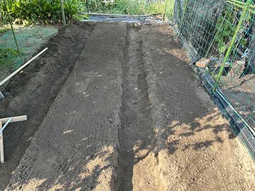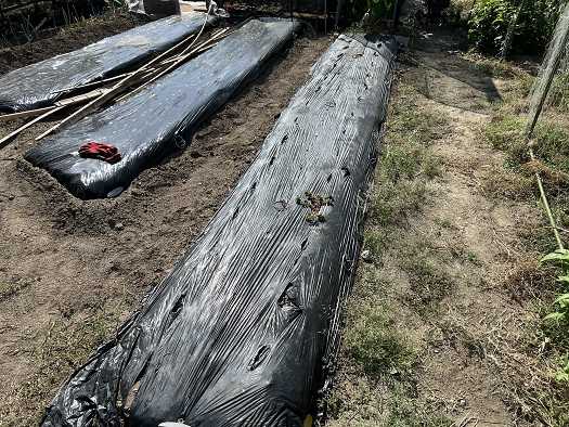 最近、朝晩の気温は若干ではありますが、マシに感じられます。でも、当分の間は、最高気温は34~35度前後の日が続くようです。早く秋らしい気候になって欲しいです。タマネギの植付けは、まだ2カ月先ですが畝の準備をしました。左の2畝は先日、耕運をした畝です。今回は右端の畝を耕運。マルチを剥がし、苦土石灰を散布。マルチをしていたこともあり、土は柔らかで楽に耕運できました。畝を上げ、使い古しのマルチをして完成です。11月の植付け時に表面を軽く耕し植付ける予定です。