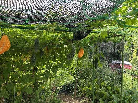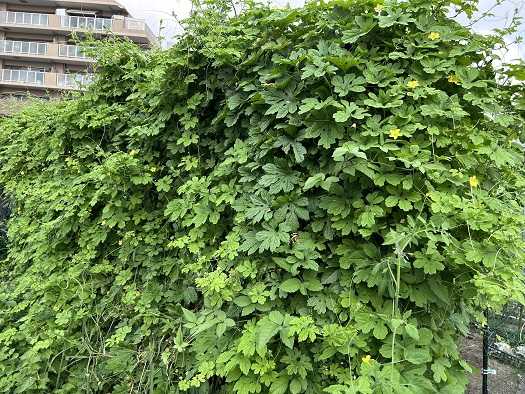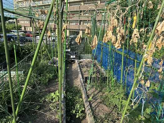 今年のゴーヤは例年になく大豊作でした。でも、そろそろ撤去を考えなければいけません。例年なら蔓の手入れなどをするのですが、今年は手入れを全くしていません。なので新しい蔓が次々と伸びて子蔓。孫蔓の上に覆いかぶさるようになっています。区画の外から見たゴーヤ。区画の中から見たごーた。もう撤去をしようかと思っているのですが、まだ蔓は青々としていますし、沢山の小さなゴーヤが着果してくれています。さてどうしたものか。