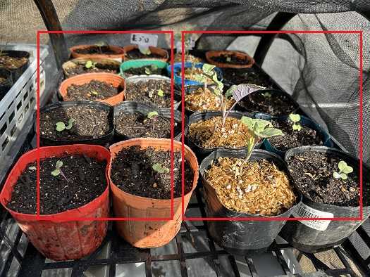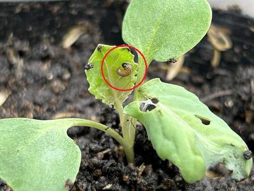 9月4日に発芽したキャベツの苗をポット上げしました。13本発芽しましたが、新芽にハイマダラノメイガの幼虫を発見。3株に幼虫がおり、既に新芽が食われていましたので処分。最終的にポット上げしたのは10株となりました。既に3株が被害に遭いましたが、これ以上被害に遭わないよう注意をしなければ・・・。