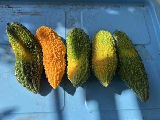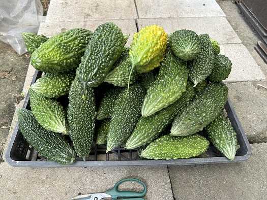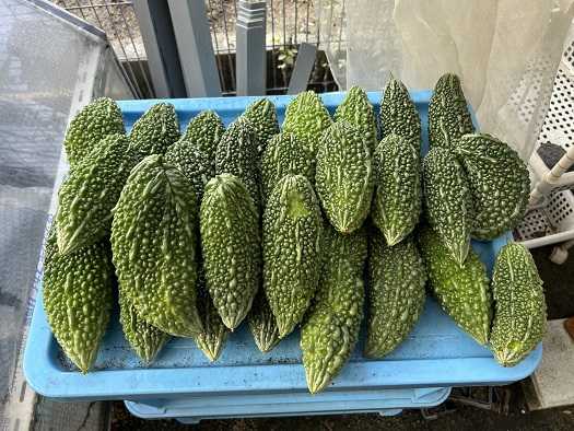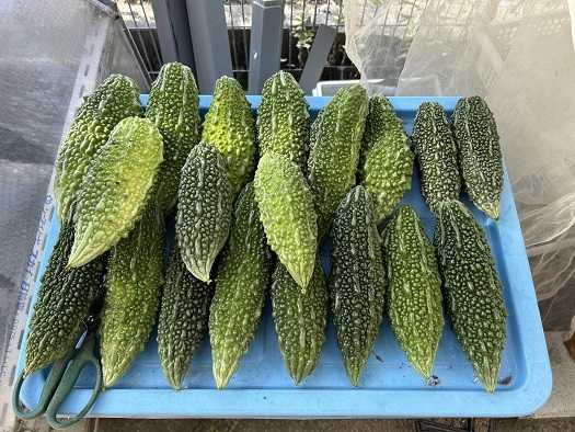 鈴なりに生っていたゴーヤを収穫。今年のゴーヤは大豊作、蔓の剪定をせず、二週間に一度、化成肥料を追肥していたのがよかったのかも。しかし、収穫が出来るからと言って、何時までも撤去せずに置いておくのもねぇ。何処で踏ん切りをつけ撤去しないといけません。今回は30本を収穫、内処分は5本でした。処分した中には虫の被害に遭ったものもありました。苦いのに食べる虫がいるのに驚きです。まだ沢山の小さなゴーヤがぶら下がっているので、暫くはこんな状況が続きそうです。