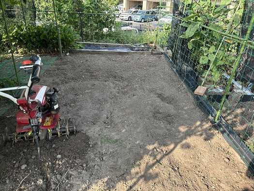 スイカの蔓や雑草の手入れが終わった跡地を耕運しました。この程度の広さなら耕運機で15分もあれば耕運できるのですが、土が固く締まっており耕運するのに一時間近くかかってしまいました。今回は、肥料も入れず耕しているので、畝上げをする際に再度肥料を入れて耕運する予定です。