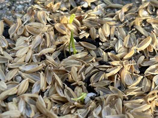 ゴーヤの落種が棚の下に発芽しだしています。例年のことですが、この時期になるといたる所から発芽しだします。どうせ発芽するのなら春になってから発芽してくれるといいのに。