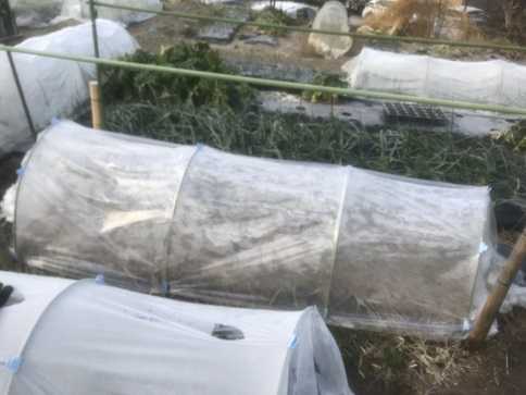 ビニールをすると日中の温度管理が大変なのですが寒波が去るまで透明のマルチでトンネルをした方がいいだろうという事で不織布の上から透明マルチでトンネルをしておきました。