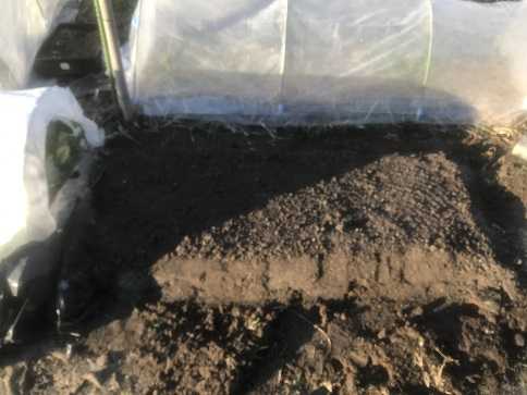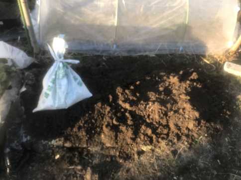 スコップで軽く耕し、残っているホウレン草の根を取り除き鶏糞を投入。