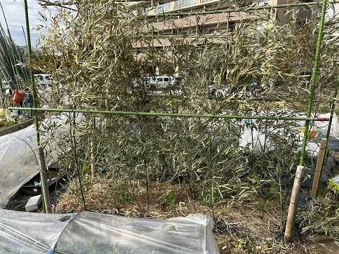 キュウリ用のネットを使用しますけど、今回は竹の枝で蔓受けをという事です。