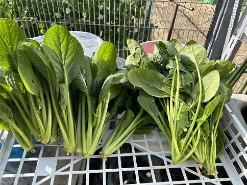 まだトウ立ちをしていない小松菜と第5弾のホウレン草を収穫。ホウレン草は欲張って株間を詰め過ぎたせいで徒長になって茎ばかり伸びています。