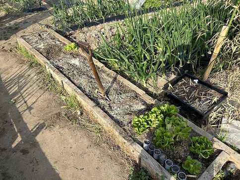この場所にはサラダ菜にリーフレタス、芽挿し栽培用のジャガイモを植付けていましたが芽挿し栽培をしたこともあって一部を耕運しました。一部にはサラダ菜とリーフレタスが少し残っています。