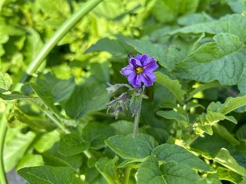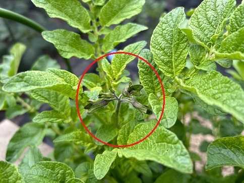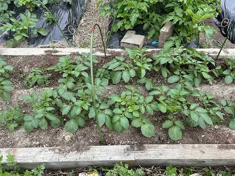 通常栽培のジャガイモは芽挿し栽培と比べると栄養分を種芋から吸収できるせいか生長もかなり早いです。右が芽挿し栽培のインカで左が通常栽培のインカ、違いが一目瞭然です。
