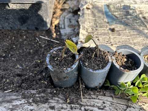ムカゴから発芽したものは一年では大きくなりませんので、今年は来年用の種芋として育てる事に・・・取り敢えず塩ビ管に移植しておきました。