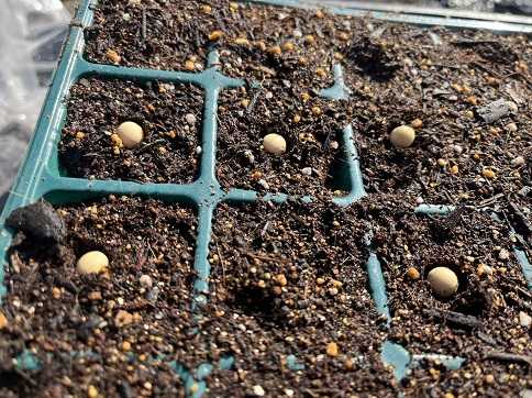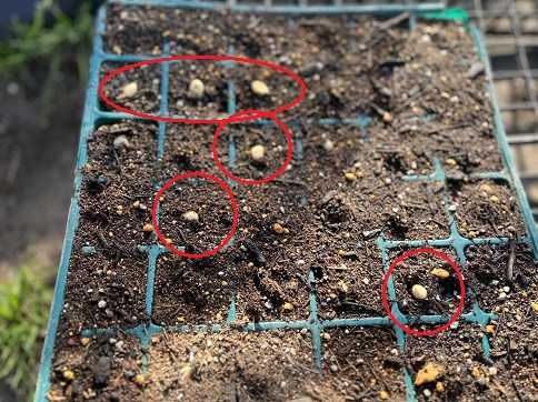 先日種蒔きをした枝豆が土から顔を出しているものが・・・少し覆土が少なく水遣りで顔を出したようです。よく見ると顔を出している種がダンゴムシに食われ穴が開けられていました。