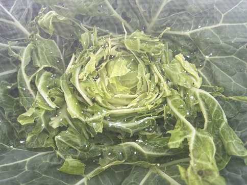 葉を捲ってヨトウムシを探しましたがキャベツの中に入っているのか見つけることが出来ませんでした。キャベツの中に入っているのであれば、どうしようもないのでヨトウムシに差し上げるしかないようです。( ノД`)シクシク…バリバリ捲っていたらこんな状態になってしまいました。