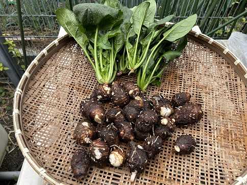 土を取り除き収穫できたサトイモは、数は少ないですが、前回同様、満足できるサイズのイモが入っていました。ついでに数株残っていたホウレン草の収穫をしています。