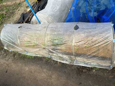 これからホウレン草畝にもビニールトンネルをしなければいけないのですが、現在、発芽待ちの小松菜を植付ける頃に防虫ネットからビニールトンネルに切替えるつもりです。