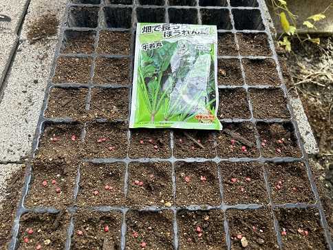 先日購入した正月菜と第4弾のホウレン草の種をトレイに蒔きました。どちらも種を蒔いたのはいいのですが場所が・・・さて何処かに場所の確保しなければいけないです。ざっと区画を見渡すとピーマンと甘長唐辛子を撤去すれば何とかなりそうです。